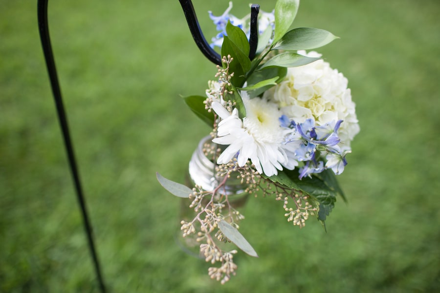 Annemarie and I made the men’s boutonnieres and our bouquets the night before. To keep costs down I had ordered dried flowers, fall-colored leaves, and premade bouquets on-line. We took the premade bouquets apart and added the dried flowers, asparagus, cotton blossoms, and lavender we cut from the garden to create beautiful and unique arrangements for the wedding. Scouring thrifts and antique stories I found some awesome pieces – pens for the bouquets and vintage handkerchiefs that I had “Let’s go JO!” “September 1, 2013” stitched on as gifts for our close friends and family.