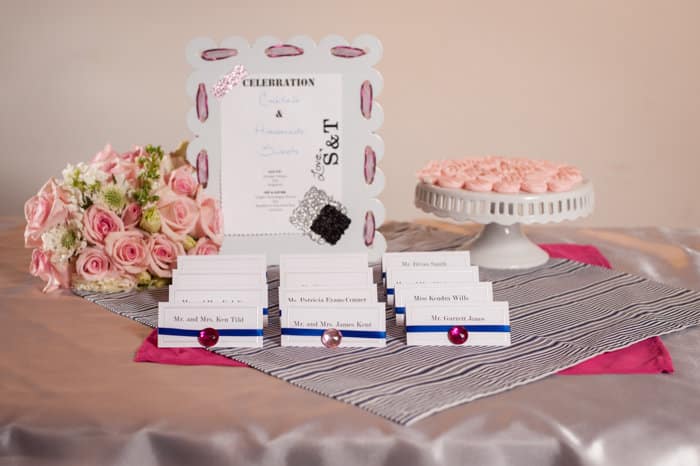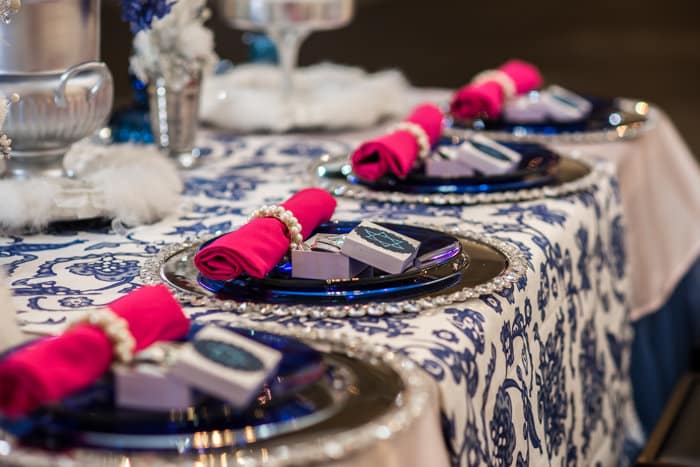 The table was skirted with a handmade blue tulle wrap. A light pink satin linen was chosen for an overlay. It was then finished with a blue flowered linen and tucked to create a “draped” look cinched together using real flowers and blue lace as a tie. Favors included handmade boxes displaying a sparkled Star of David and filled with silver & blue dreidels, along with dark chocolate Gelt.