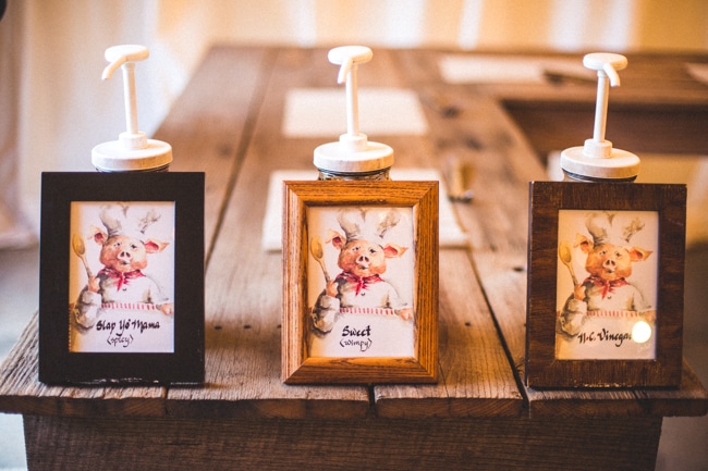 Our wedding favors were also a little offbeat – we knew the caterers who prepared our amazing barbeque would be offering three of their homemade sauces to choose from, so we wanted guests to be able to take home their favorites after they had tried them. We purchased an extra few gallons of different sauces from the caterers and filled them ourselves in simple glass bottles.
