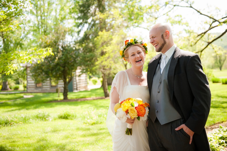 We chose orange and yellow as our colors because they’re so bright and cheerful. We also chose the charcoal gray suits because Tyler’s favorite color to wear is charcoal, and it just happens to go really well with bright colors. We really liked the old-fashioned cut of the suits because they looked great and traditional while still being “out of the norm”.