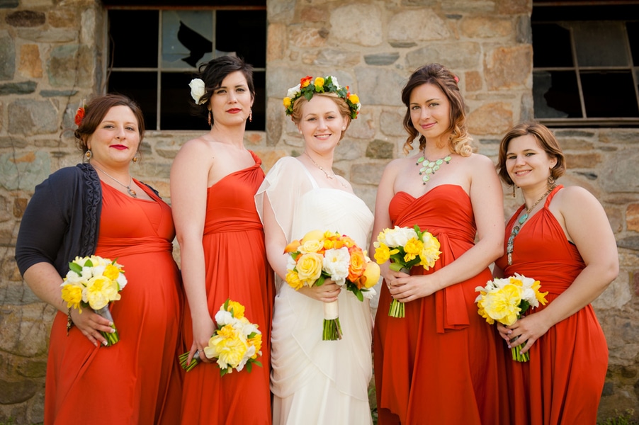 orange chameleon bridesmaids dresses nontraditional fun bridesmaids portrait picturesgroomsmen charcoal suits orange and yellow wedding party orange and yellow wedding party