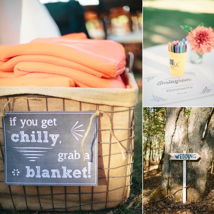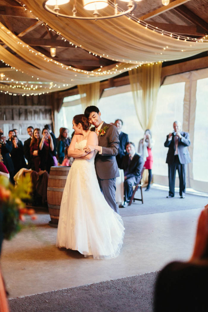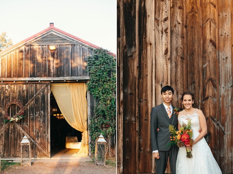 The wedding elements were picked based around a rustic chic theme, since we love this style and it alludes to our hometowns (Texas for Jess, and growing up across the street from a horse farm for Kim). A lot of our choices were also based on the season we were married in, so there were a lot of oranges and reds and yellows, and all of our flowers were what was fresh at the time like zinnias, mums, and proteas.