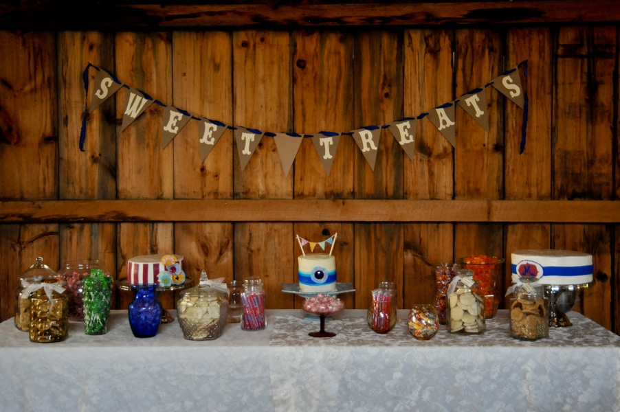 We tried to add as many special touches as possible. Some of our favorites included the striped popcorn bags on the tables and the oversized balloons on the picnic tables. We choice to use vintage medicine bottles for centerpieces, which was another personal touch we both loved. We brought a vintage popcorn machine as well as a home-made picture stand. We really tried to personalize the wedding with our own creativity and style.