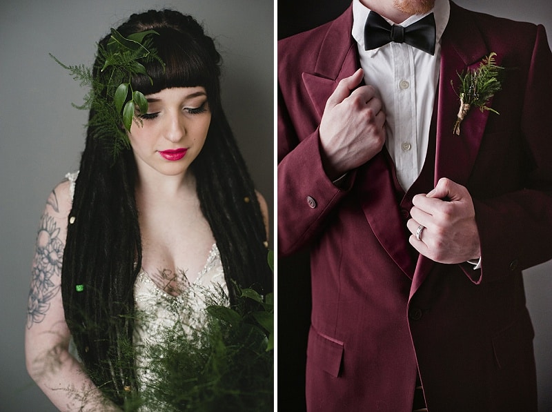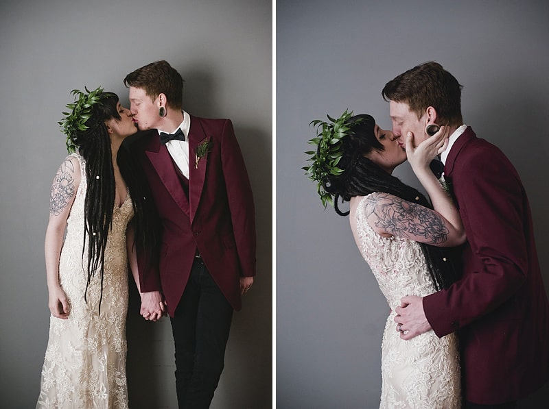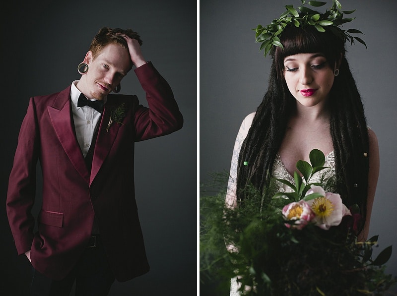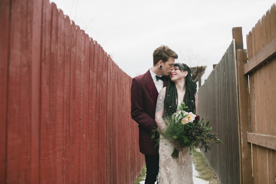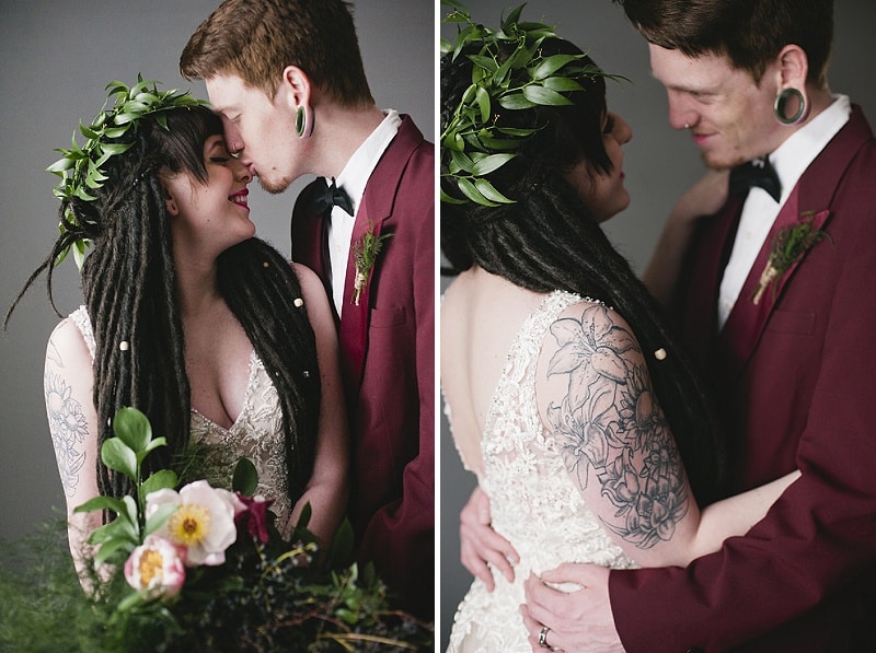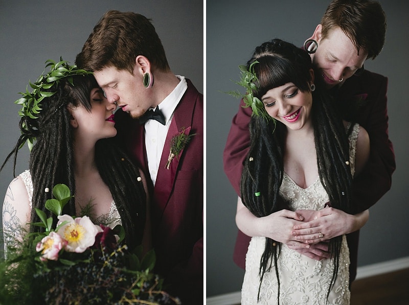 I’m talking tattoos, dreadlocks, gauges, and the sickest maroon suit. Ever. Why don’t more grooms rock a maroon suit? Seriously! There is also a seriously stunning bouquet, made by Soil and Stem. Less from me, more from Amy Cloud.