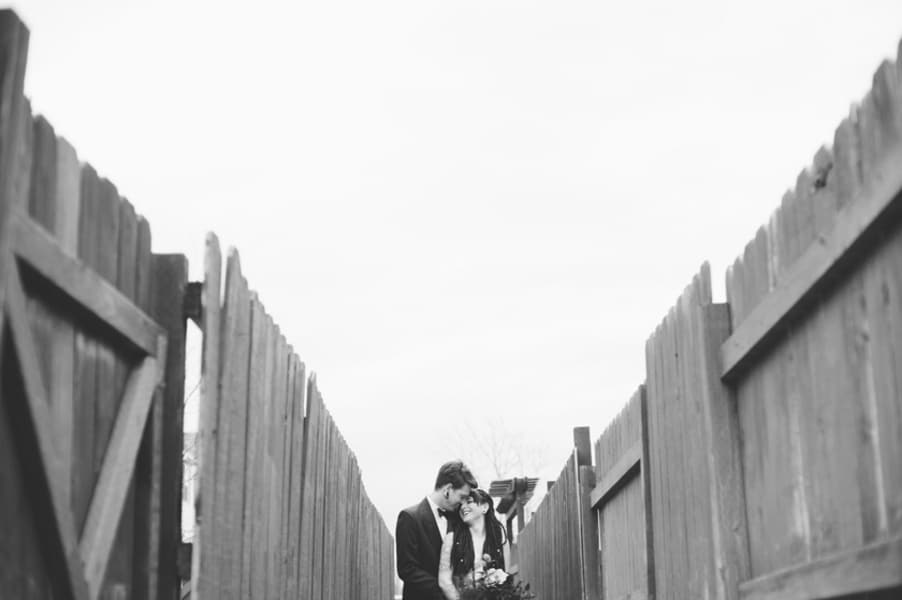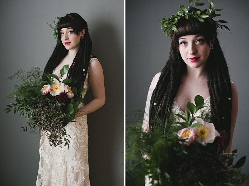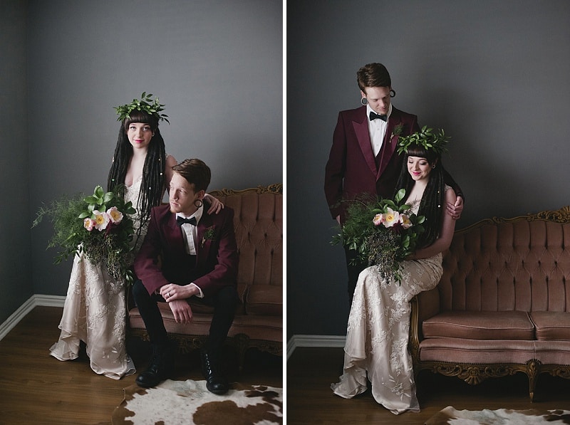In talking we had originally planned on an outdoor location that was more industrial and grunge. However on the day of the shoot, it was horrid cold outside but we had to go on because the flowers were bought and ready to go. We opted to shoot in my natural light studio and ran outside really quick to this quirky little alley way for some shots at the end. These two had the most amazing style and were so easy to work with.