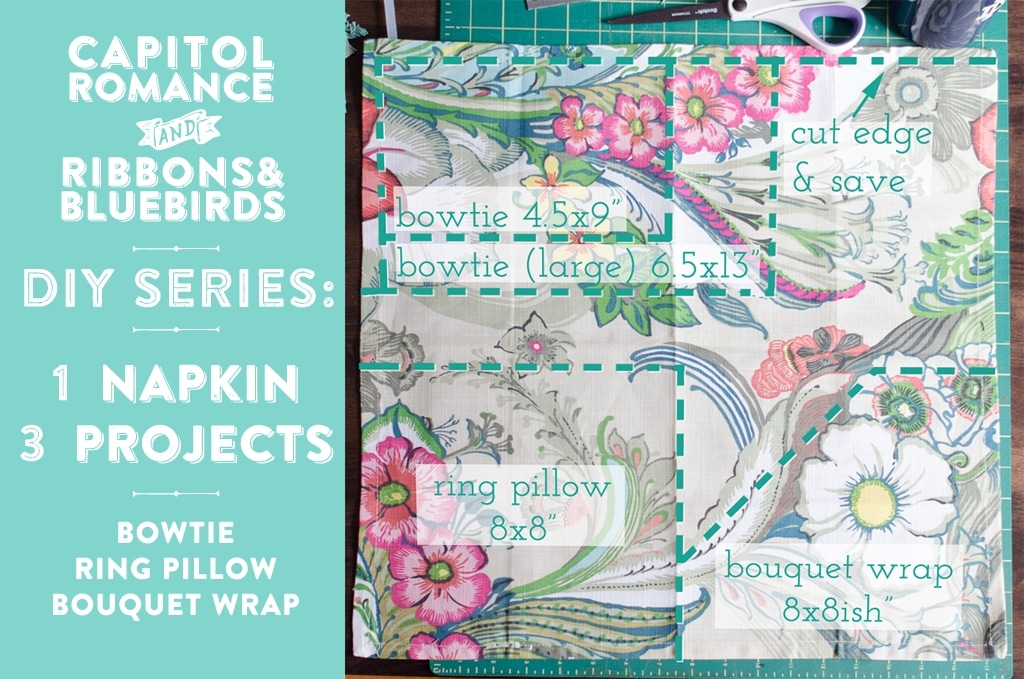 Happy DIY Wednesday Romancers! I am in a fog of lack of sleep after a bachelorette party weekend in AC and then a quick 2 day trip to Florida to visit Andy’s grandpa. So please excuse my grumpiness, typos, and other sleep-deprived nuances. Today we are sharing the last of our 1 Napkin, 3 Projects DIY tutorial series from Ribbons & Bluebirds. We already covered an adorable DIY Bouquet Wrap and a DIY Fabric Bowtie and for today we have a DIY Ring Bearer Pillow!