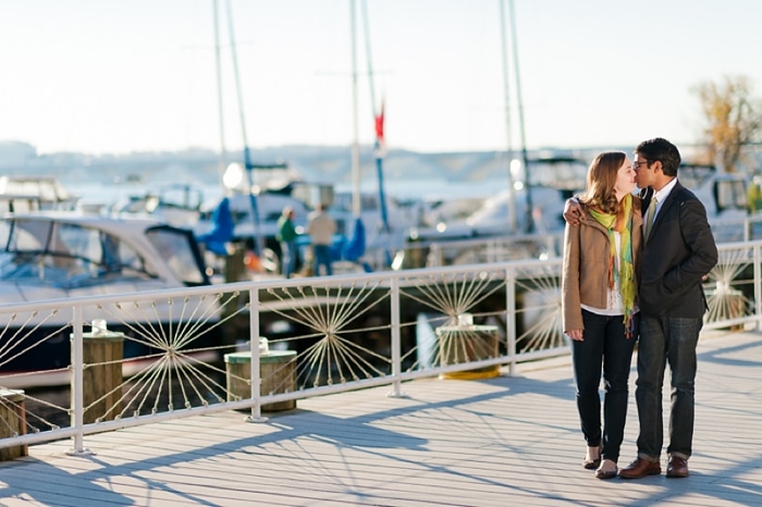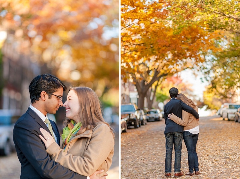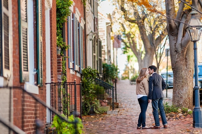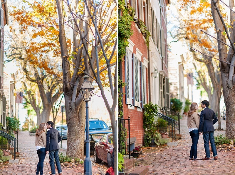 We chose Old Town Alexandria because we’re getting married in northern Virginia and because of its beautiful historic cobblestone streets. We had a wonderful shoot (and we were very fortunate with the lighting and the fall colors!). We even got to sneak in a picture of us on a bench facing the water, which is how he proposed to me in Edinburgh!