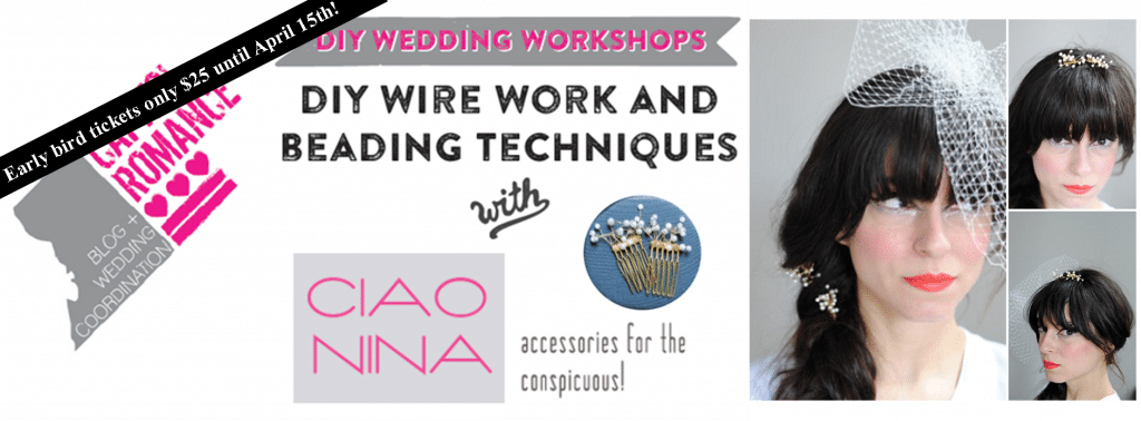 And just in case this is the first time you are hearing about our first DIY Wedding Workshop, let me tell you briefly about it. On May4th we will be hosting CIAO NINA to teach attendees of our workshop how to make a custom gold, haircomb from a wire and beading technique! This technique can be used to create boutonnieres, centerpieces, and even decorations. The unique haircomb you will make will be a perfect addition to your veil, a snazzy splash of sparkle to your rehearsal dinner, or just a nice custom piece to have in your hair for your reception.