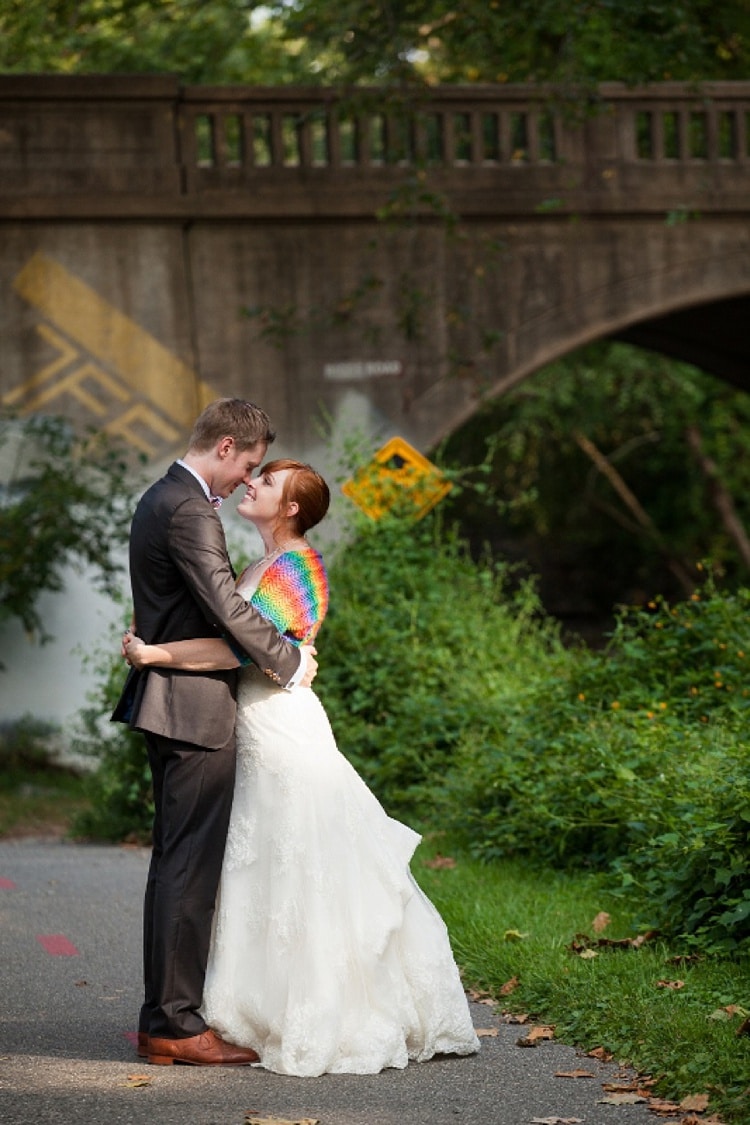You might remember Eliza & Josh from their insanely adorable, “nerdy” library engagement session that we featured a while back. Well they’re back now (and better than ever) with their super awesome, completely DIY, rainbow-themed wedding at Adelphi Historical Mill! Eliza & Josh used a ton of awesome local wedding vendors to knit their wedding day together and also recruited the help of ALL their family and friends to make it happen. I know you guys are going to love all the awesome, personalized details in this Maryland wedding AND all the super rad, rainbox wedding decorations & details. So enough from me, more from them.