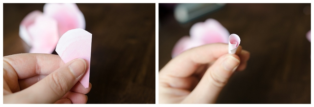 For the inside of the flower, start with the smallest individual petal piece and roll into a cone. Glue along the edge to hold it in this cone shape. For the two and three-petal sections, overlap just a bit of the edges and glue to form cones for each of them.