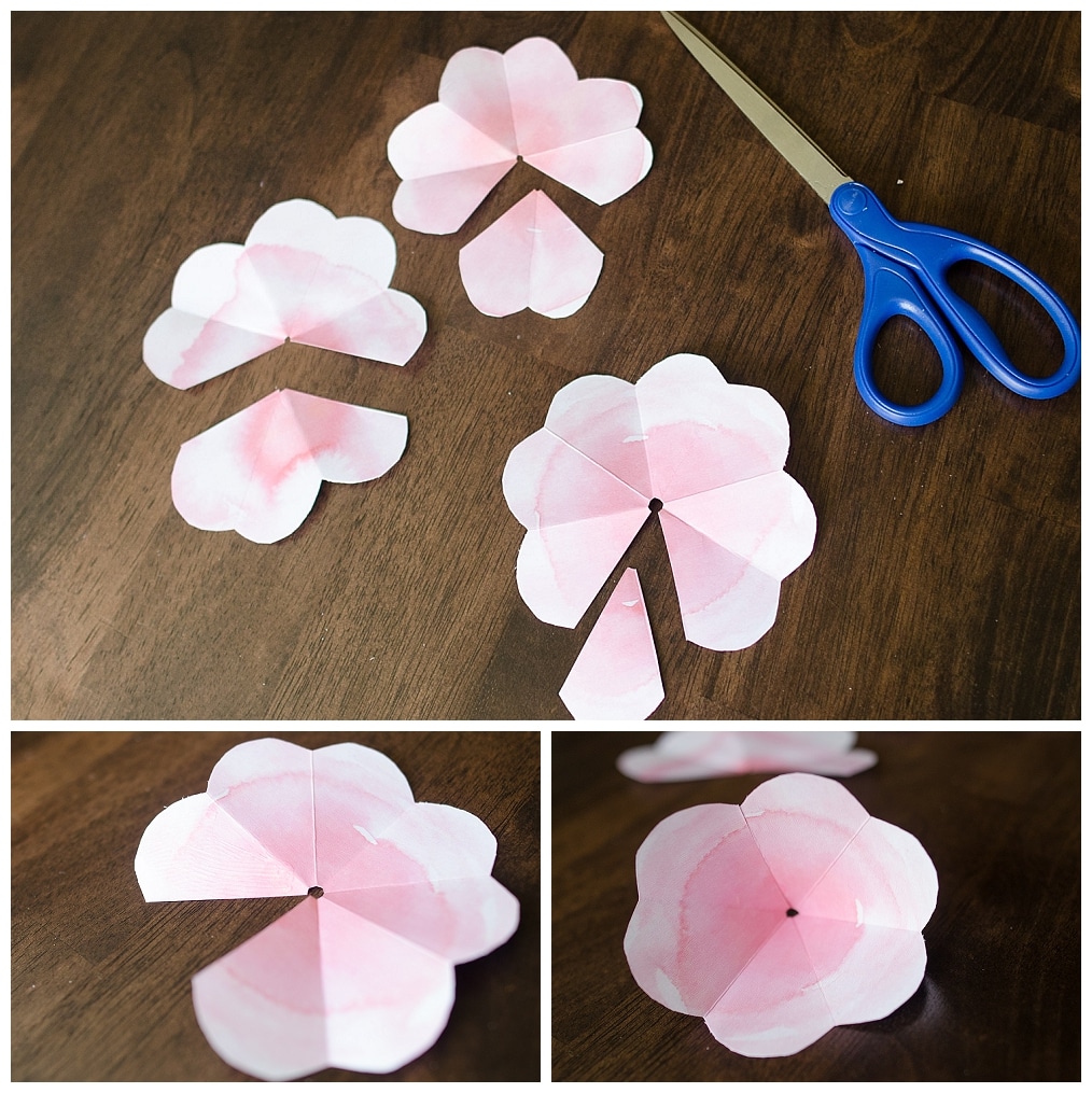 From your first paper flower layer, cut out one petal along the fold lines. For the second, cut out a chunk of 2 petals (1/4 of the flower) and for the third, you guessed it, cut out a chunk of 3 petals! Save all the smaller pieces you just cut, as they’re going to form the center of your flower.