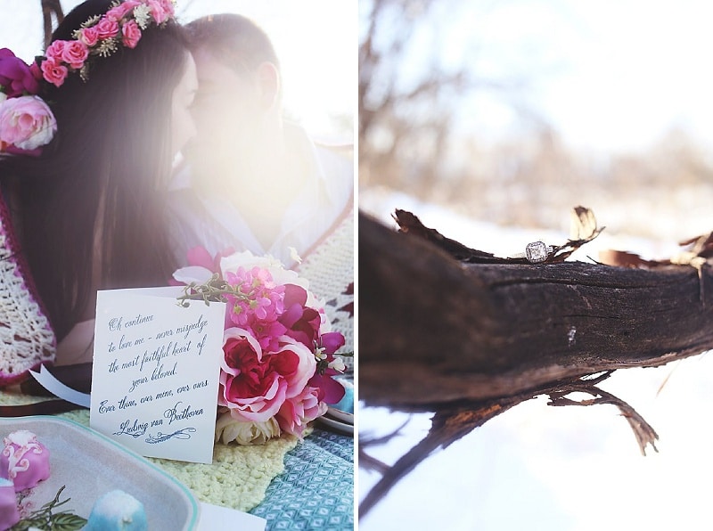 Click inside for the rest of this styled, snowy engagement session, including the proposal story and a look at Melodie’s gorgeous engagement ring!