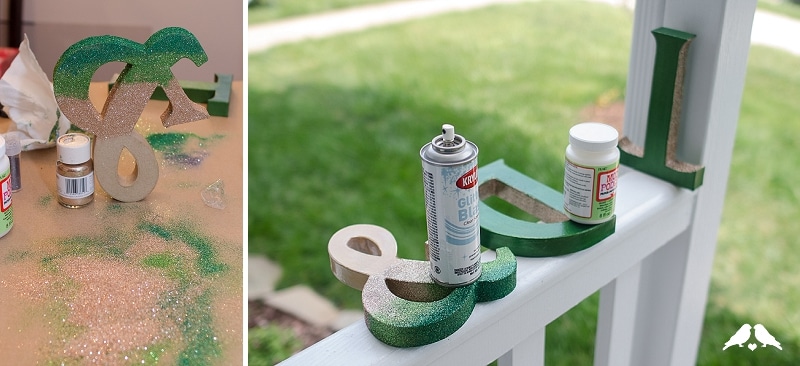 Step 1. If you’d like to paint the background of your letters, now is the time! I painted my D and T initial letters in a rich metallic green paint. **I highly recommend painting or sealing paper letters – I decided to leave the top of my ampersand blank to let the kraft paper shine through, and that ended up being a mistake. When I sprayed the glitter sealer the kraft paper got very blotchy. I ended up needing to paint over it in a pale gold to match the glitter.**