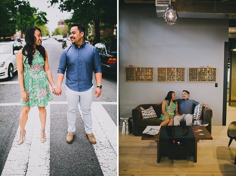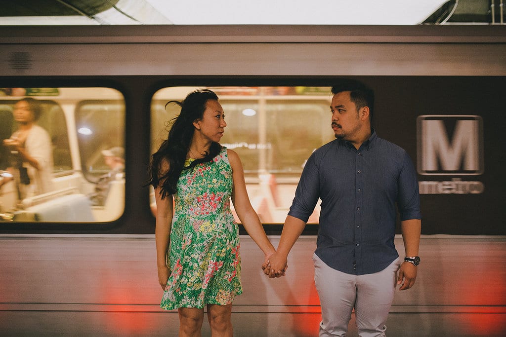 Happy Monday Romancers!!! We are BACK in action after a full-fledged wedding weekend down in Virginia Beach. I had the absolute pleasure of being a wedding GUEST this weekend (actually a Bridesmaid at that!) and I am still recuperating a bit from all the dancing. Working weddings is a KILLER for someone, like me, who LOVES to dance. My dance itch was nearly incurable and my husband even said to me that I was clearly making up for some lost time at the reception. My feet are still throbbing a bit (and I wore flats!). Needless to say, I cut a rug, and then some. But onto today’s blog post! Thanks to Val & Sarah (gahhhh I love these two), I have an awesome, laid-back Washington DC engagement pictures session to share. Michelle & Ron took their engagement pictures in their neighborhood and even down in the metro!