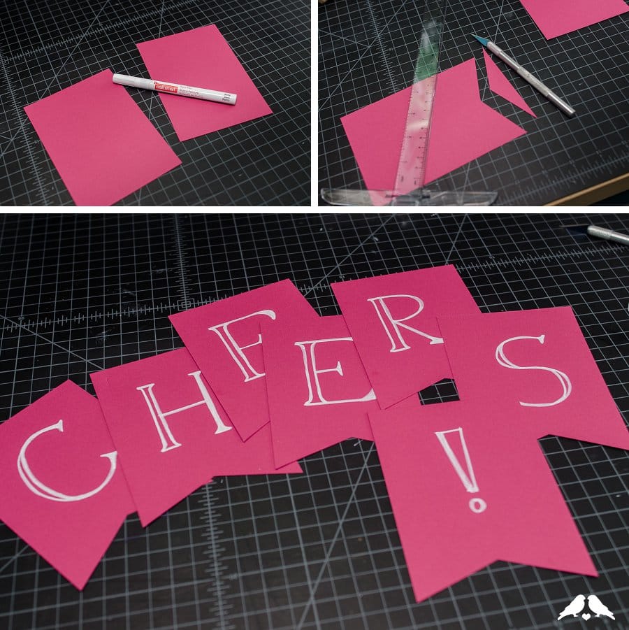 Step 3: Make pennants for message. If starting with 8.5×11 sheets, cut into quarters for 4.25×5.5 final size. To add the flag detail at the bottom, measure up ¾” from the center of the bottom, and cut from the bottom corners to that point. Use a paint pen to draw your letters (or purchase pre-cut out letters to use) and finish by punching holes at the corners for mounting.