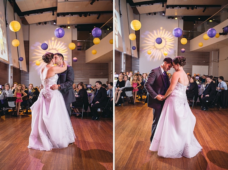 Tim had a vision for the ballroom at the Artisphere and it included lanterns. He found purple and yellow ones online and ordered batteries and lights to put in each one. With the help of several friends, we ended up staying up super late the Thursday before the wedding putting the batteries/lights together for each lantern. It turned out that the lights weren’t needed due to the great venue lighting but the lanterns themselves looked awesome hanging throughout the space.
