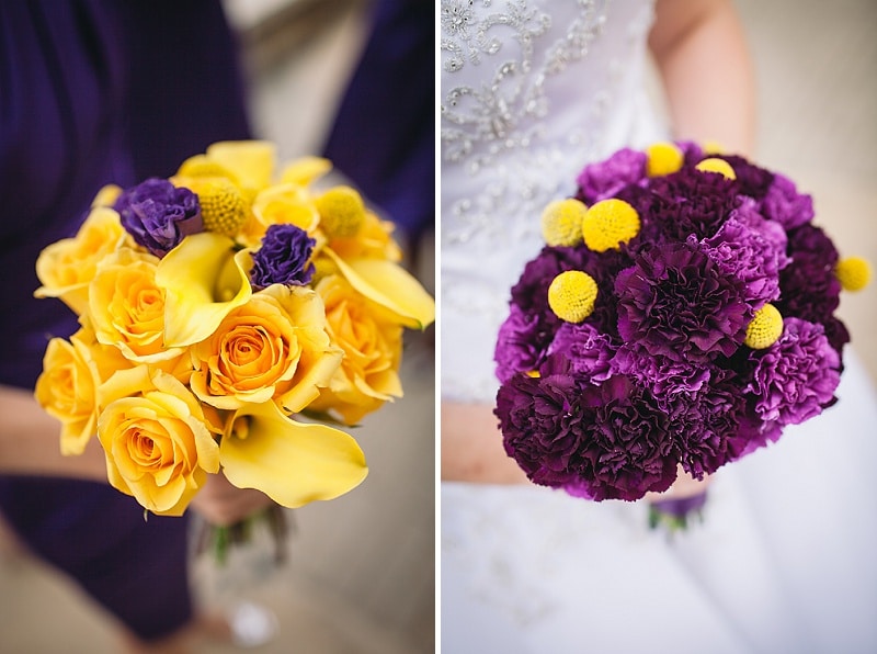 We chose purple and yellow for two reasons: It’s the Fraternity colors of the Coed Honor Fraternity, Phi Sigma Pi, that we met in (I married my brother……lol). It also happens to be the colors of James Madison University which I was willing overlook seeing as I’m a Wahoo :-) I originally chose multiple colors (think the Skittles rainbow), but with Tim’s input we together decided that purple/yellow best represented us.