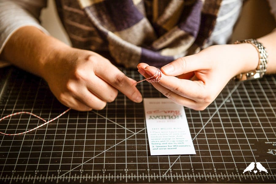 Step 2: Cut a section of baker’s twine long enough to float the spices in a large pot, and still wrap around the handle to prevent the tag from falling in.  Tie a large knot at one end, and wrap some excess around two fingers to bundle it in a neat coil – this will be stored inside the tag until the spices are being used.  Set the coiled twine aside briefly.