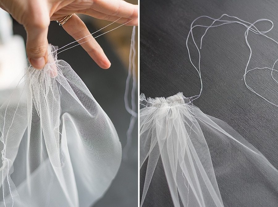 Step #5: Now it’s time to gather the fabric to morph it from a piece of flat tulle into a veil. To do so, hold the veil and gently pull the bobbin thread for each straight line of stitches. Your fabric will begin to gather.