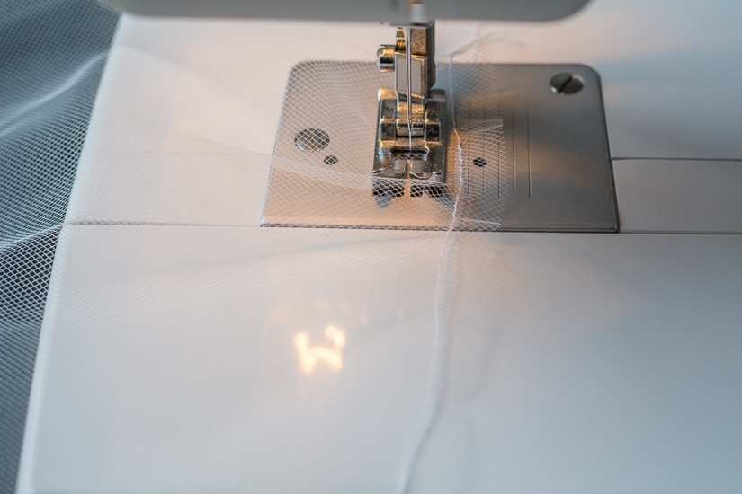 Step #3: It’s time to sew. Set your sewing machine on the longest stitch length and sew a straight line of stitches along the top (one of the width sides) of the veil. Make sure to leave a long tail from your bobbin thread.