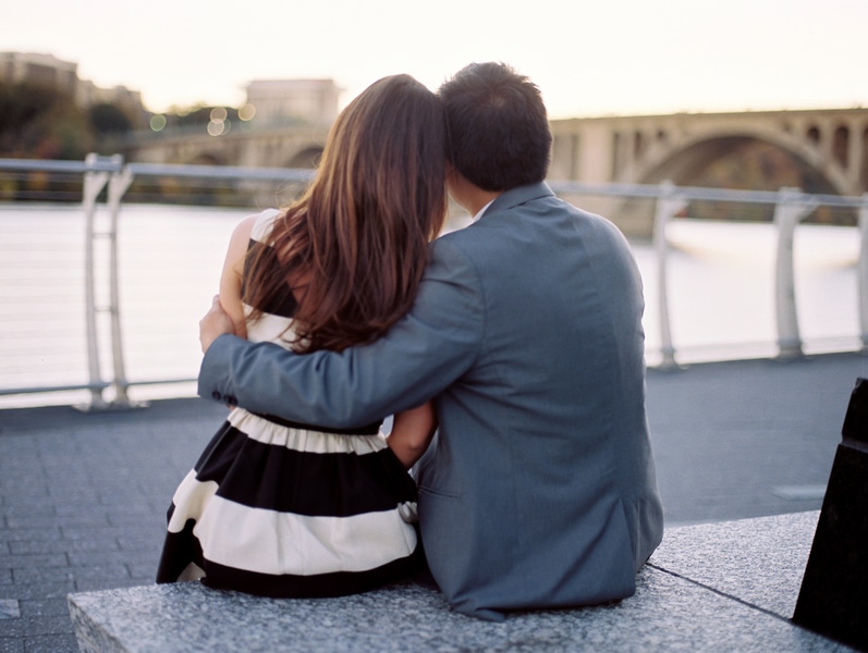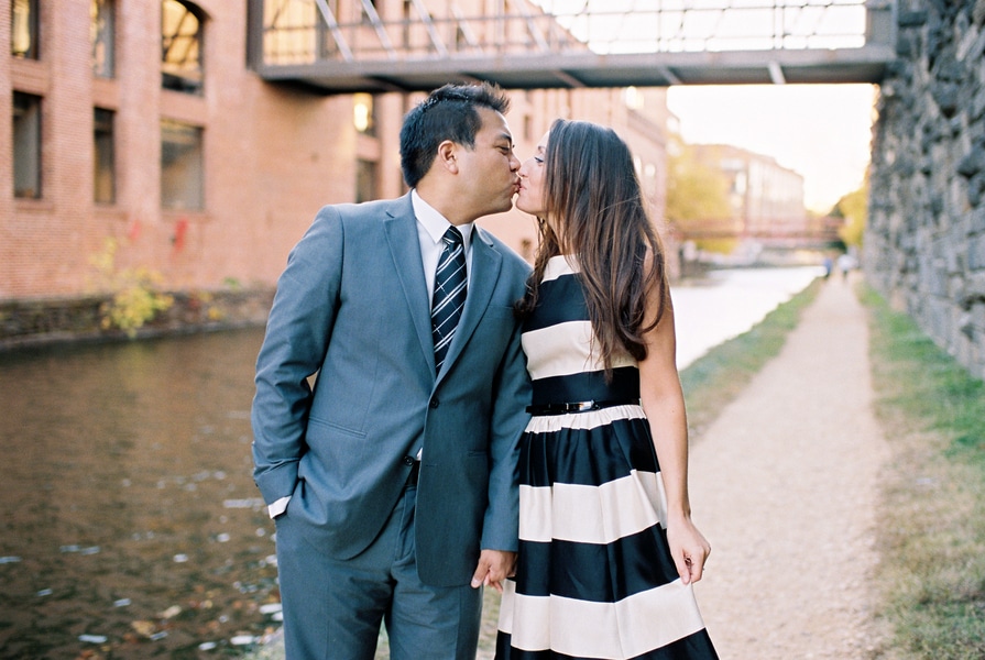 Patrick selected the engagement ring on his birthday. He wanted to remember the moment when he found the perfect one and he knew Kate wouldn’t suspect he was shopping for her that day. Although he had been plotting elaborate proposal schemes, including a fake fall during a run downtown, Patrick decided to pop the question at one of the couple’s favorite places– Georgetown Waterfront Park. The couple held their engagement photo session at the same location. “Kate and Patrick told me that their favorite D.C. locations were in the old part of town, including some contemporary locations along Georgetown Waterfront Park and some archetypal locations such as the old Aqueduct Bridge.