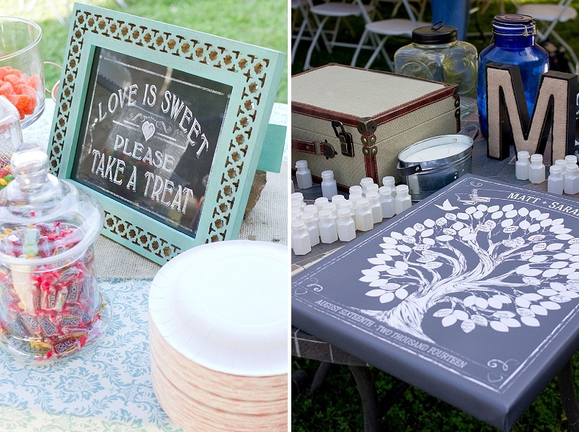 The mason jars we used for the flower arrangements were from Matt’s aunt/godmother that she had at her house and I decorated them with burlap and lace. Our officiant was my husband’s best friend from college and he wrote our ceremony for us. I did not want things to be too matchy-matchy. Instead of renting linens I bought different fabrics from the store for the tables. I made the banner that hung above the sweets table with burlap and fabric. My husband made the mason jar lights and wine bottles lights that were either hung or placed around the venue. Our videographer/late night DJ was a good friend of ours from the OBX.