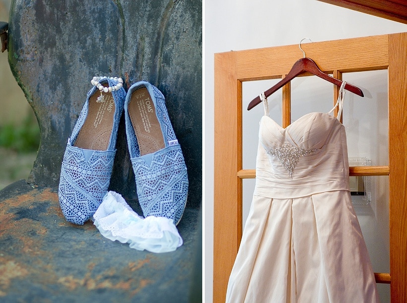 Since my dad passed away several years ago I placed a photograph of him in a chair next to my mom. Matt was really close to his uncle who had passed away the previous summer so one of his work hats sat next to his aunt during the ceremony and matt later wore the hat through the reception. We did not worry about too many traditional details. Matt and I worked together all morning on helping set up the wedding, we did not do a bouquet toss,or the family dances. I loved that we waited at the end of our buffet line for a “receiving line” so I was able to see and talk to each guest. I did do something blue which was wearing blue toms :)