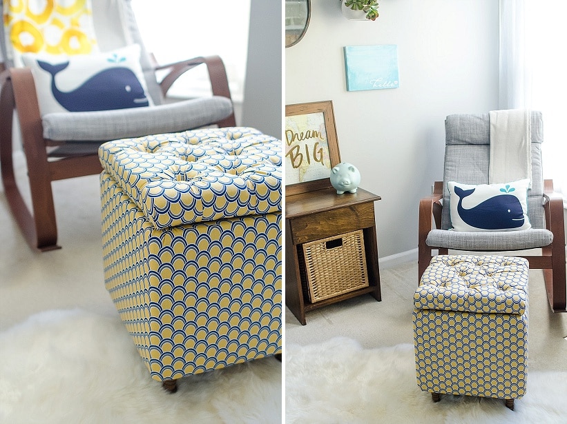 We’re back for DIY Wednesday with Part 1 of a DIY tutorial to make a super awesome upholstered storage ottoman – perfect for a home office, bedroom or nursery. I took the easy way out and bought a super cheap yellow one from IKEA for our nursery, but DIY maven Jenn’s is SO MUCH more awesome. One because she made it, and two because it’s completely customized! Take it away Jenn!