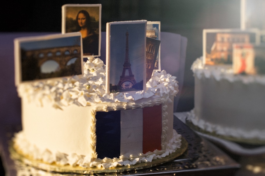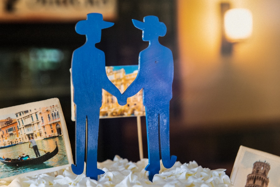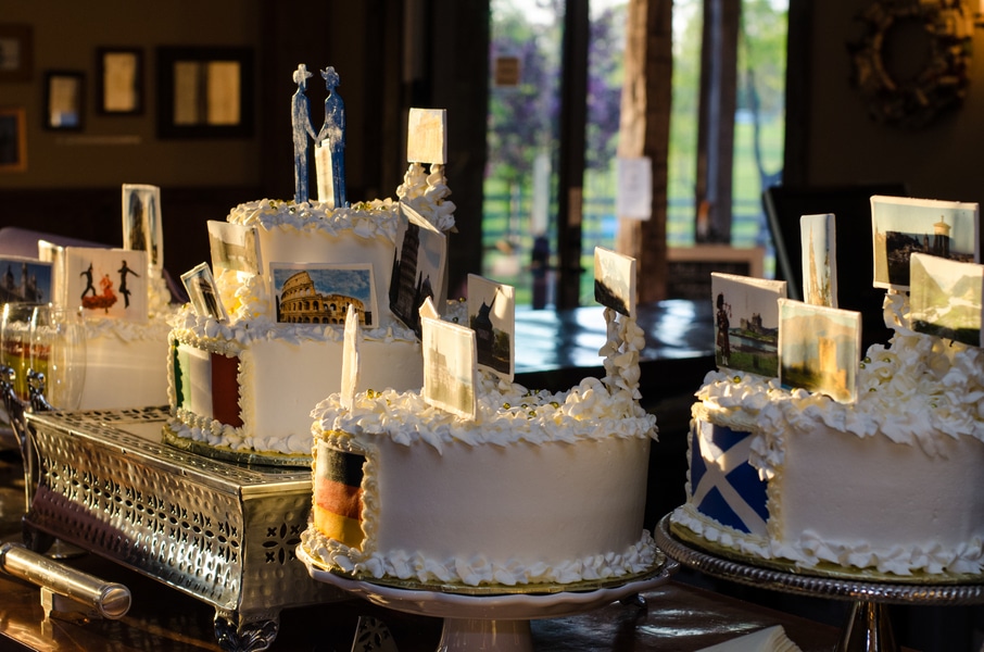 And now for today’s real wedding! Brad and Matt have been together for 16 years and engaged for 4. They have a great love of travel, and so the variety of wedding cakes they had designed, each represented a country/city they visited!