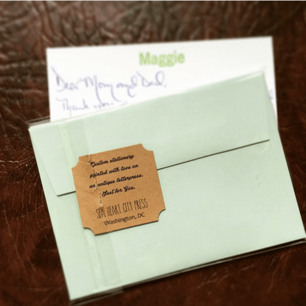 The wedding scene in Washington DC can feel rather small sometimes. I’ll get emails from small business owners that I’ve never met and be shocked that we’ve never crossed paths somehow! This business even moreso, seeing as the owner, Meredith, grew up down the street from my Aunt up in New Jersey! Crazy! Meredith runs a little letterpress & design studio and she offered to host a giveaway here on the blog for some custom stationery that you could use to send to your wedding party with their gifts!