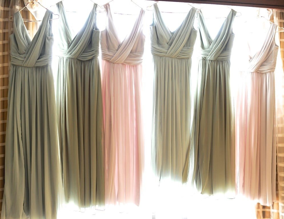 The bridesmaids wore long Dessy gowns that were identical in style, but different shades. To try to go with the dusty, muted shades of succulent and lavender, I chose two shades of slightly different earthy, muted green and a light grey in the same color palette. I admit I agonized a bit too much over the color choices, and it was a bit of a risk to try to match these colors, but I was determined to be true to my favorite color palette and pull off a more unique palette. In the end I’m so happy with how the look turned out. The earthy greens and grey paired perfectly with the understated dusty dried lavender bouquets. The groomsmen wore navy suits with black ties and shoes.