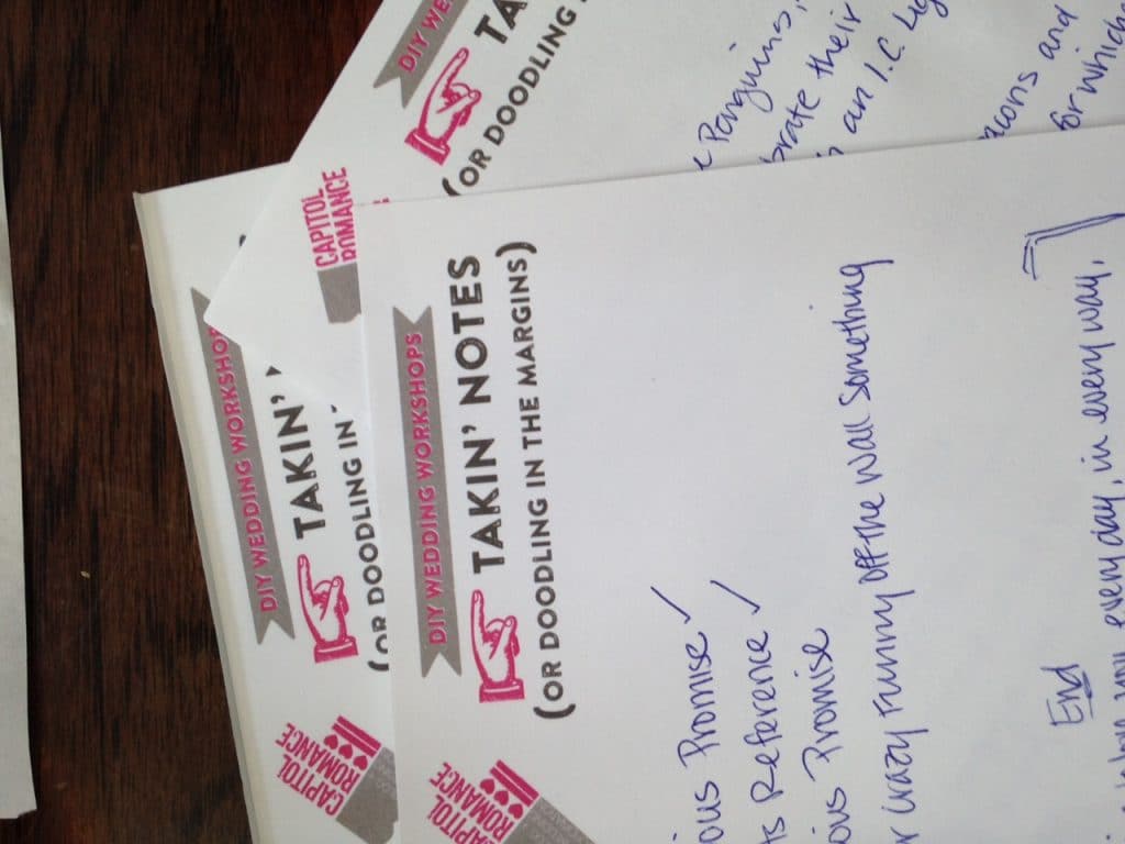 #2. Make an outline Just like you learned back in middle school, the best way to start writing something is by creating an outline. I think this is particularly if you’re going to write your vows separately. You don’t want one person’s vows to be chock full of inside jokes, while the other person’s are really serious. There should be some symmetry there. We wanted to keep our entire wedding light and fun, so we decided to alternate our vows between serious and funny lines.