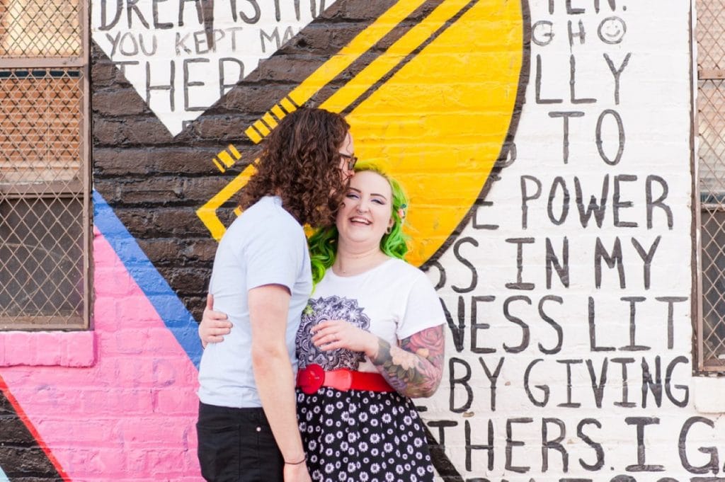 It’s MONDAY. Where does the weekend go? We spent ours completely cleaning out and re-organizing the office (aka CapRo Headquarters). It felt good but took SO LONG. This weekend we’ll be trekking up north (NJ and CT) for my neice’s 1st birthday! Just crazy how fast the days, months, years fly lately. So without more from me, I can’t WAIT to share this super rad engagement session this morning. Tattoos, GREEN HAIR, murals, and so much love & laughter. Let’s get to it.