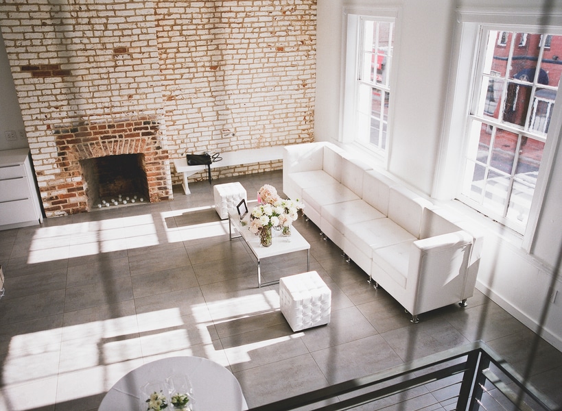 Still snowed in over here Romancers. Andy is currently (attempting) digging our car out so we can make a desperately needed food store run. For today I have a gorgeous, modern & intimate DC wedding for you – which I’m not going to lie, is part awesome wedding and part awesome interior design inspiration. This house (the exposed brick! the modern furniture!) is GORGEOUS with it’s open loft feel, and modern/clean aesthetic. For the bride & groom, it was the perfect venue for their 60-person wedding. We’ve got all the deets below! Happy Tuesday.