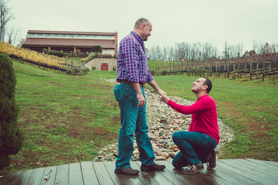 We originally met Troy and Manuel while shooting a styled session, back in November of 2014. The pair had been dating for just a couple of months, at that time, but they played the part of a marrying couple for the day! We remained friends with these great guys and during the first week of November, 2015, Troy contacted us to ask if we’d capture his surprise proposal to Manuel, which we were thrilled to do!? We pretended to just ‘run into’ the guys, at a local winery, on a rainy Saturday afternoon. Manuel had absolutely no idea what was about to happen. When we all took a little stroll down the vineyard, to a bridge, Troy dropped to one knee and the magic began!
