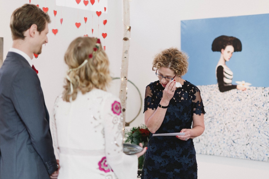 After getting ready with their own families, Liz and Gabe walked to the ceremony. Their wedding was held a few blocks away from their apartments at Gallery NK. It had the BEST light (and who can argue with a wedding surrounded by art). Liz and Gabe DIY’ed their entire wedding arch and set it up in the gallery, hung some twinkle lights and flanked it with bouquets from urbanstems . Liz’s aunt presided over the ceremony which included a ring warming, super emotional personal vows, and each of their parents giving the couple a special gift.