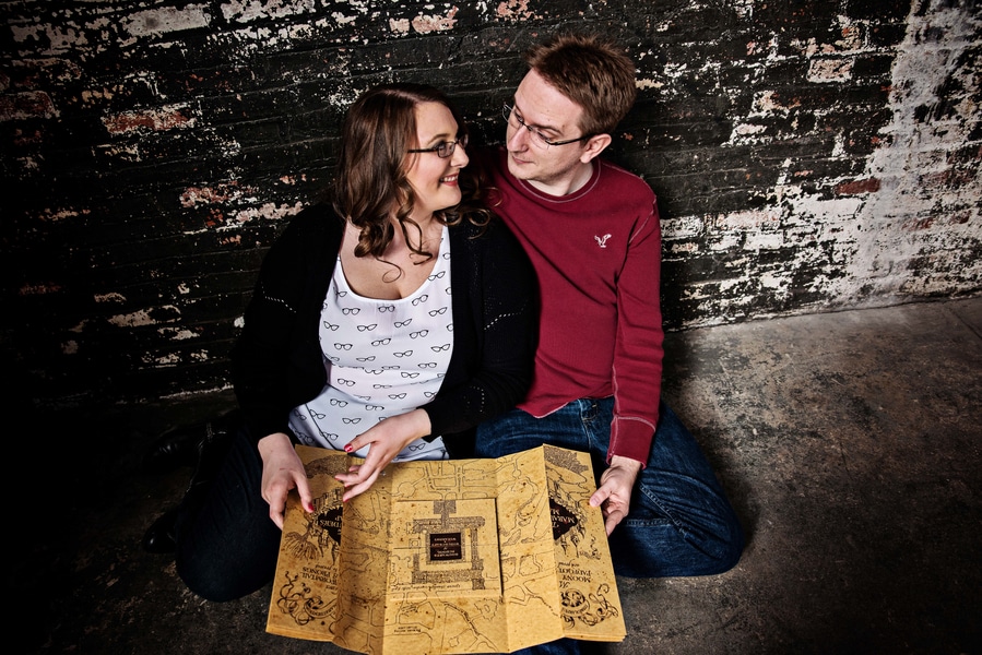 Well, we’ll sleep when we’re retired right? For today though, we are kicking the week off RIGHT with a Harry Potter themed engagement session. Marauder’s map, wands, a massive clock tower, and adorable house-themed scarves – love. Here we go!