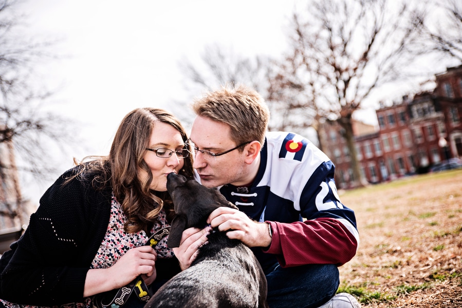 I travel a few days each month for work and Billy proposed to me one night when I came home after being away for a few days. When I walked into our apartment, I didn’t see Billy and our puppy, Pluto, on the couch where they normally are. I went to put my suitcase in our bedroom and when I opened the door, Billy and Pluto were sitting on the bed. Pluto ran out of the bedroom to the couch and when I went over to say “hi” to him, I noticed there was something stuck to his collar. It was a folded Post-it note asking if we could be a “five-ever” family (because five-ever is longer than forever, obviously).