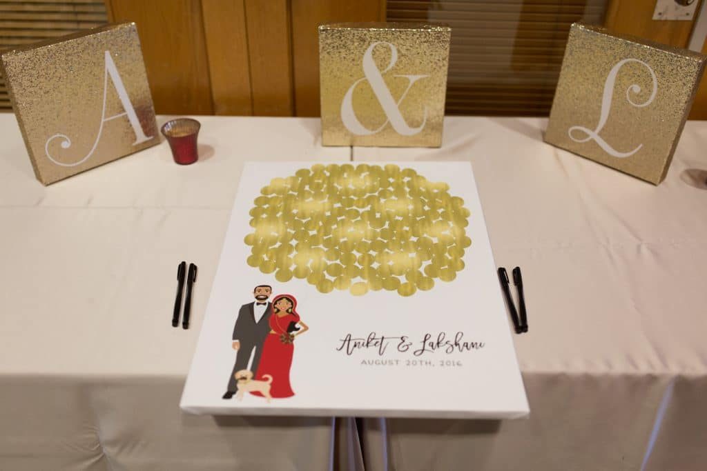 Choosing a guest book was hard for me- I did not want to do a traditional book and wanted something I would see forever. As I searched through Etsy for ideas, I came across MissBerryDesigns. This Etsy shop was able to create a canvas of the groom, bride and our baby aka our dog. They were so sweet and ensured that  I was happy with the final product. I am so happy with them, this canvas is now hanging in my living room as a forever reminder of my favorite day so far!