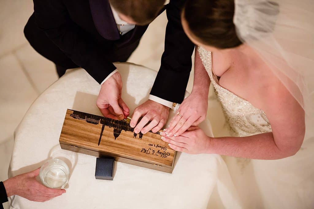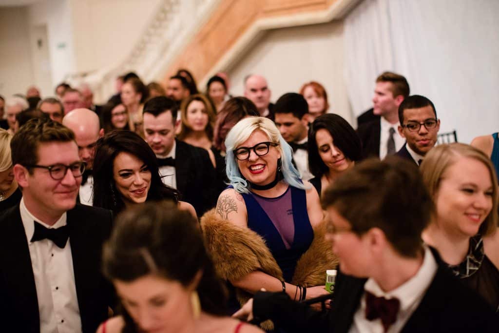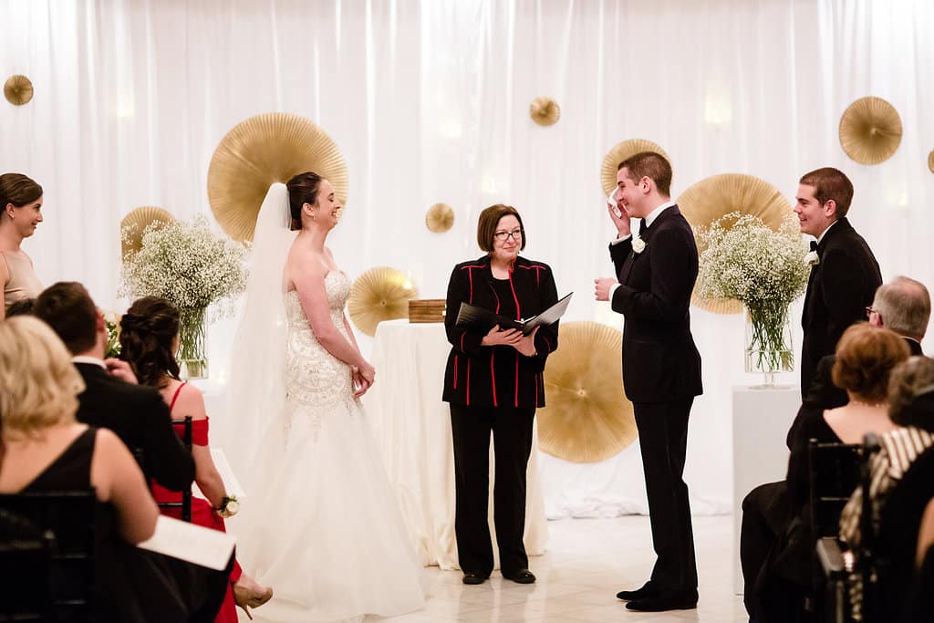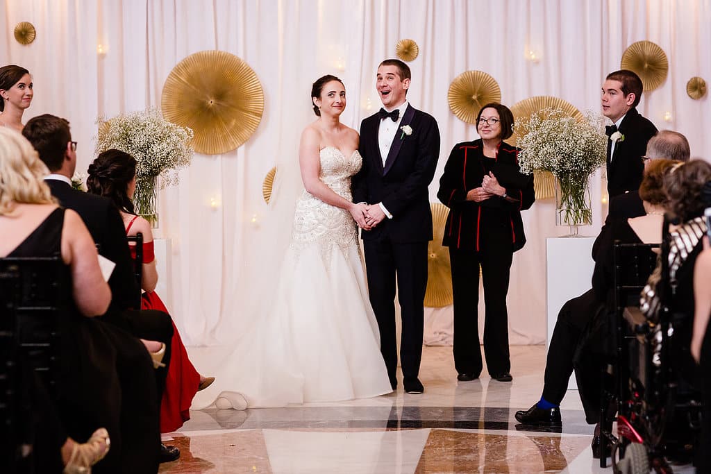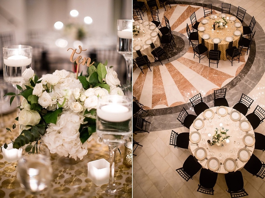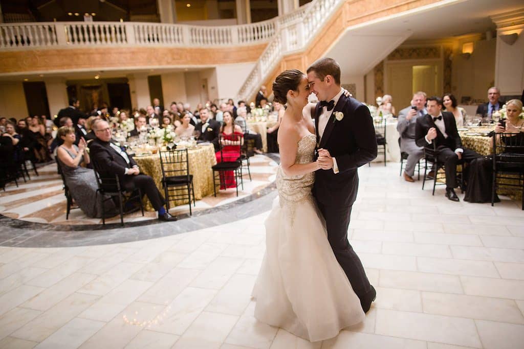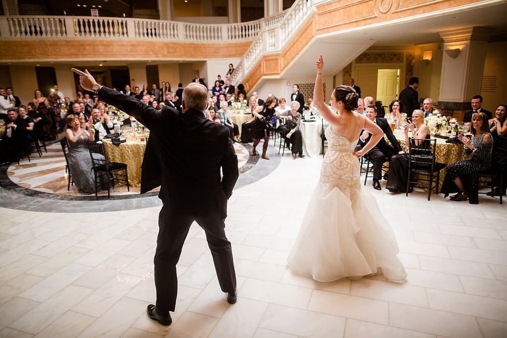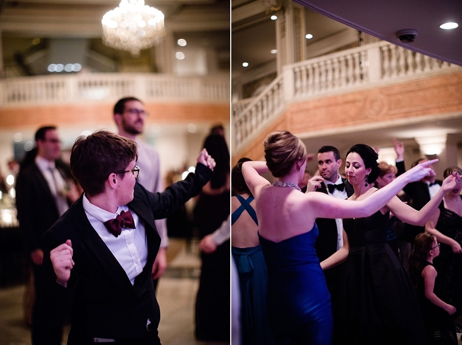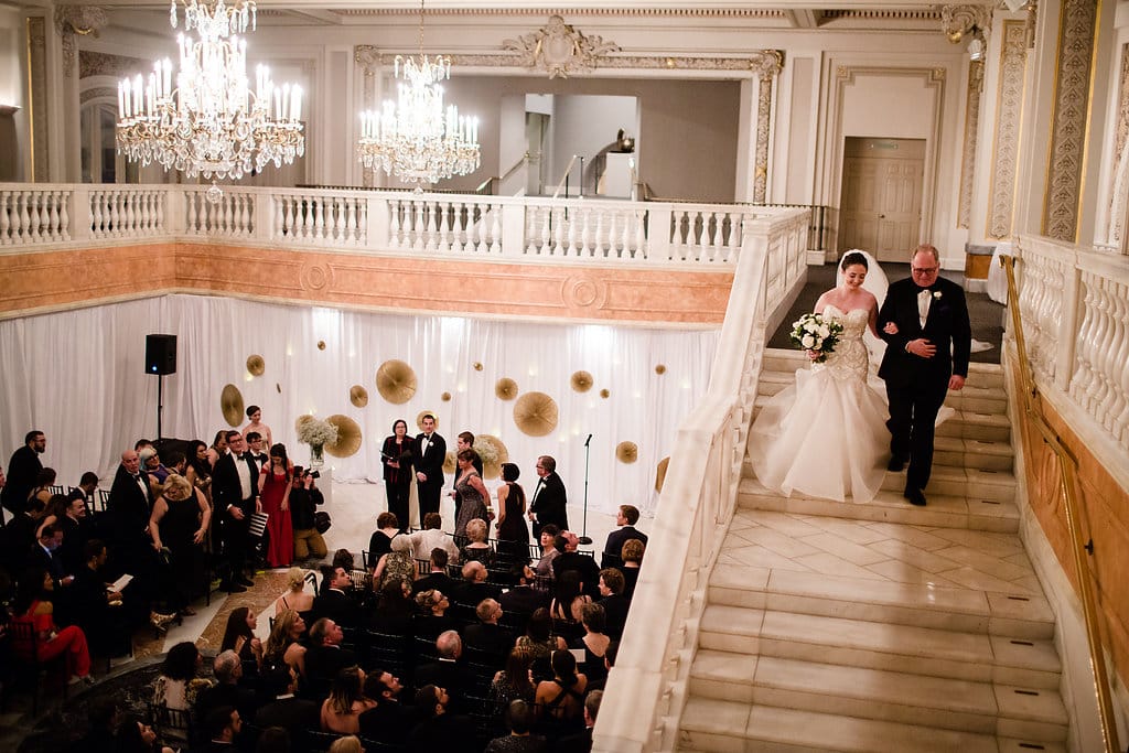 Our ceremony and reception took place at the National Museum of Women in the Arts. The space was elegant and classic, which was the perfect backdrop for our black tie wedding. Guests were greeted with coupe glasses of prosecco while the Cherry Blossom String Quartet played songs everyone knew, like Bruno Mars, Stevie Wonder, and of course, Star Wars.