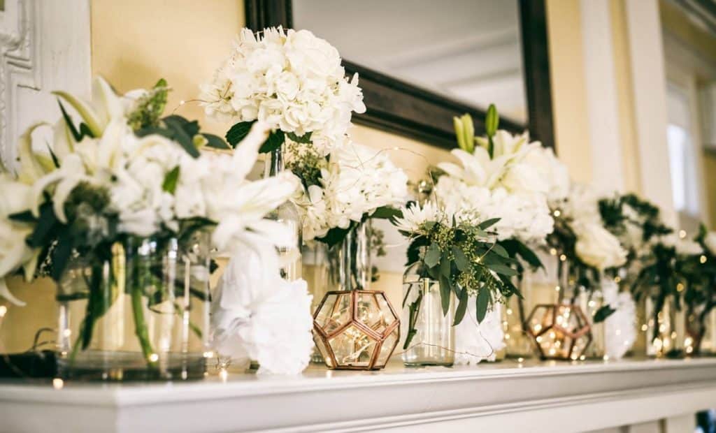 We had A LOT of decorating ideas on our Pinterest board but, as the wedding got closer, we developed a better understanding of what we could realistically do in terms of décor and adjusted our DIY dreams accordingly. Our initial plan was to buy bulk flowers and arrange them ourselves, but we realized that we had enough to worry about and didn’t want to ask our friends to do the work for us. So we hired a local florist, who ended up doing a great job. We went with all white flowers in a variety of cheap vases from Amazon, a friend’s wedding leftovers, and a motley collection of bottles that we had been collecting for months.
