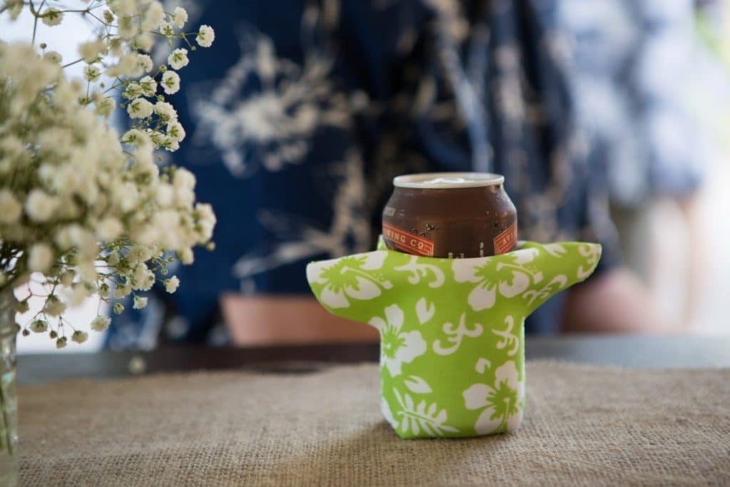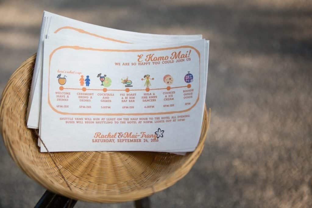 I did the invitation in watercolor, mostly orange (I love orange), so we used orange in our signs, as well as the same two typefaces from the invitation. Our creative friends even designed a floral stencil ‘aloha’ for the signs and hotel giftbags!