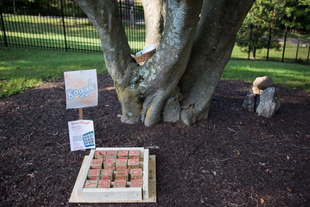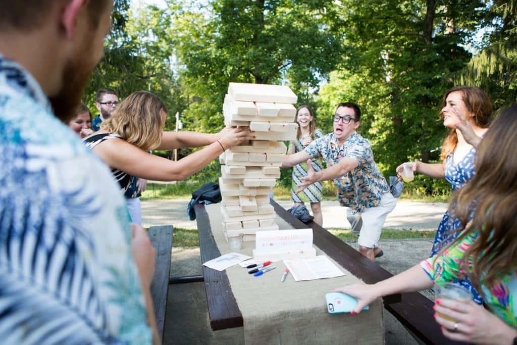 So along with at least a dozen of our peeps, we DIY’d everything from the lighting (LED lantern strings, rented up-lights for the white walls, and lots of white candles in jars), to the burlap table runners, the flowers (baby’s breath arranged in mason jars by Dawn), and the games (we made big boggle and giant jenga).
