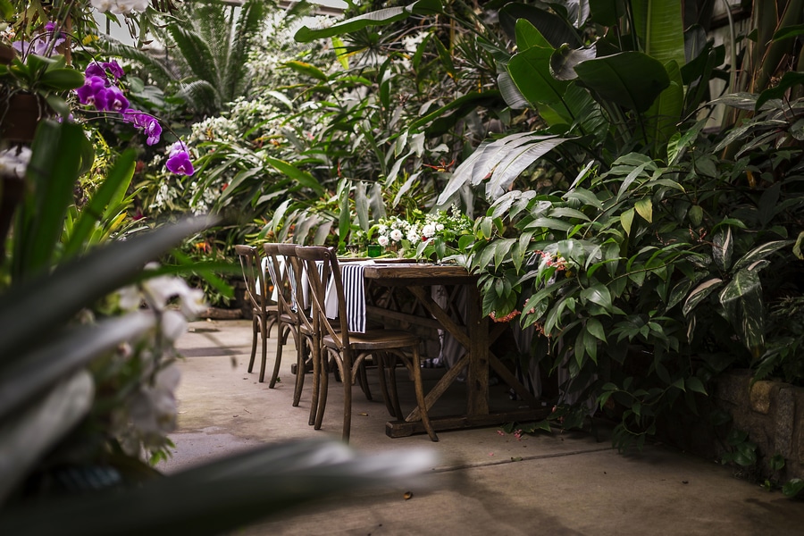 If you can believe it, the stunning Tropical House at Norfolk Botanical Garden was our backup plan. It was pouring rain outside – and we couldn’t be happier that it was. What a perfect backdrop to this eco-friendly shoot! Even the plates were biodegradable and made out of recycled materials. The glassware was made from old wine bottles. The jewelry was made from gems found in the United States, all done conflict free. Each and every detail was carefully thought out – and we love how everything turned out.
