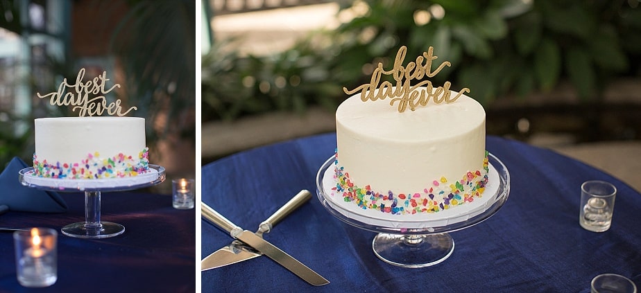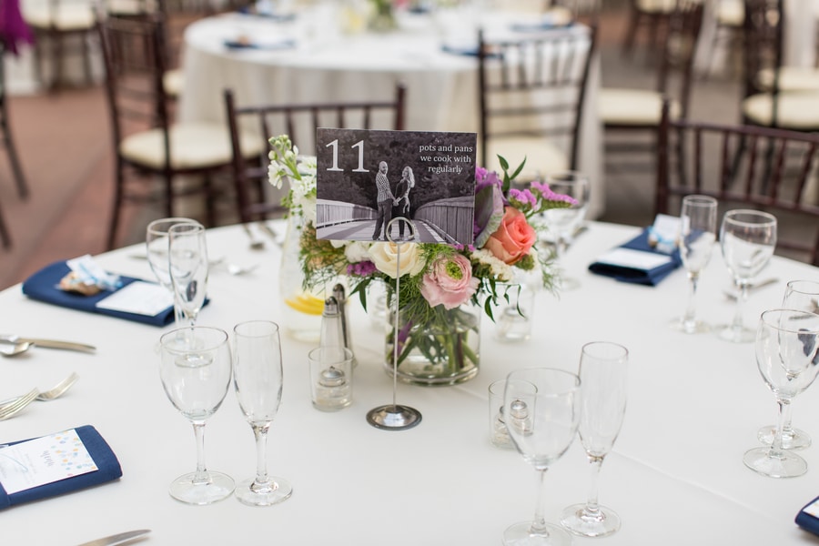 We fell in love with the natural beauty of our venue, a botanical garden, which allowed us to do minimal additional decor for our outdoor ceremony.In order to get the look that we wanted for the reception — at a price point that felt comfortable for us — we created lots of DIY elements. We created all of the table numbers using photos from our engagement shoot coupled with fun facts from our relationship, and handmade all of the signage and decor.  One of the most time consuming DIYs was my favorite — a “Mr. and Mrs. Reed” sign that we displayed at our sweetheart table. It took hours and hours to cut out the letters of a foam board with an x-acto knife, smooth over all of the edges and cover in glitter.