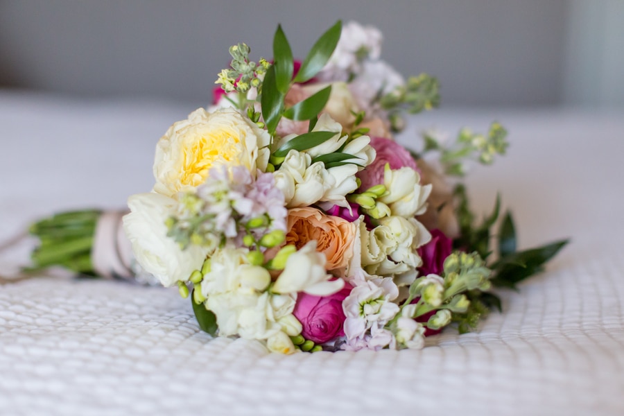 We worked with our amazing wedding coordinator, Meigh Mahaffey, to create all of our floral arrangements. As part of her services, Meigh offers a DIY floral package, and she walked us through every step of the process from selecting and ordering the flowers from a local market to assembling everything the day before the wedding. Since our wedding was at a botanical gardens and the space was so naturally beautiful, we kept the floral arrangements relatively simple and used them to bring extra color into the day. As a nod to our love of food, we incorporated kale into all of the bouquets and arrangements, and we also included hops in all of the boutonnieres since Alex is a big beer lover.