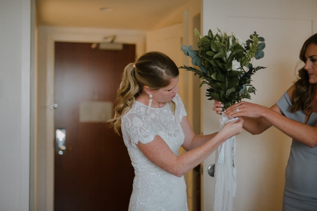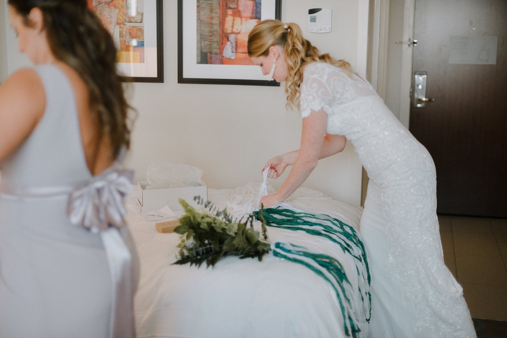 Then my sister, and fantastic maid of honor, picked me up in her car and transported the 5 gallon buckets full of the bouquet stems over to our hotel. I unloaded them and set them in the corner for the night. The morning of the wedding I got up and arranged all 6 of my bouquets. As a side note here — I didn’t practice at all for these. I had a vision, and it was pretty bohemian and messy, so I decided to wing it! I had the ribbons for the bouquets pre-made on a hanger and ready to tie around each completed bunch.