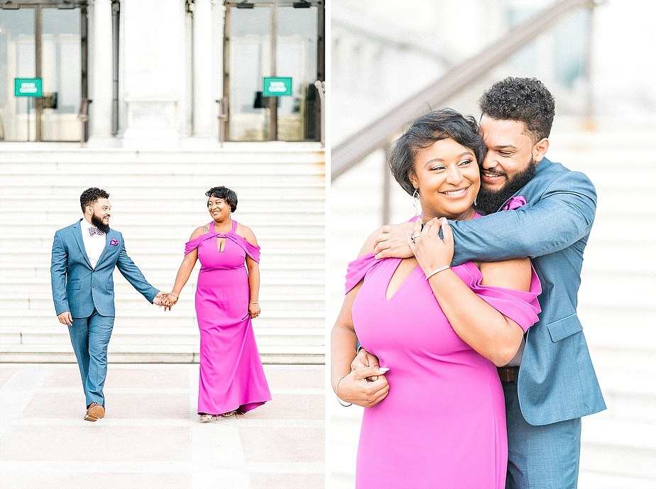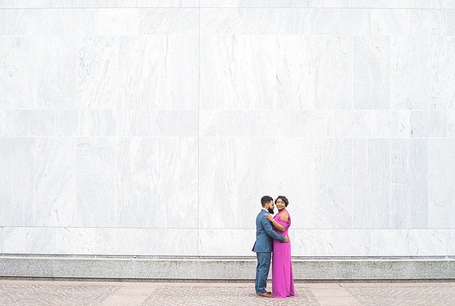 Amber and Quentin drove down from Delaware just for their engagement portraits. Washington, DC has a special place in their hearts, because it’s where Quentin proposed! We had such a fun afternoon exploring some iconic locations- Amber and Quentin wanted portraits that felt very DC-esque, so their shoot incorporated a beautiful Badgley Mischka gown and lots of marble and architectural details.