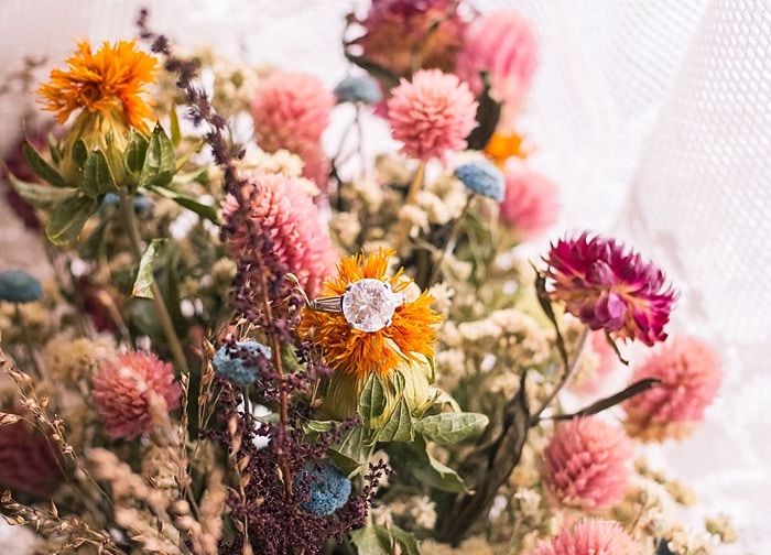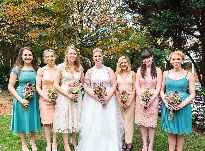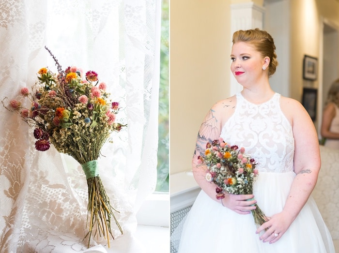 Another favorite project was the bouquets. Since my wedding was in October, using fresh flowers seemed out of place so I chose dried ones. While I purchased mostly previously dried flowers, I did make my Maid of Honor’s bouquet using flowers I dried myself from her wedding in April. For my own bouquet I used flowers from her wedding as well as home-dried flowers. Each bridesmaid’s bouquet was inspired by her individual personality. I think it was really special!