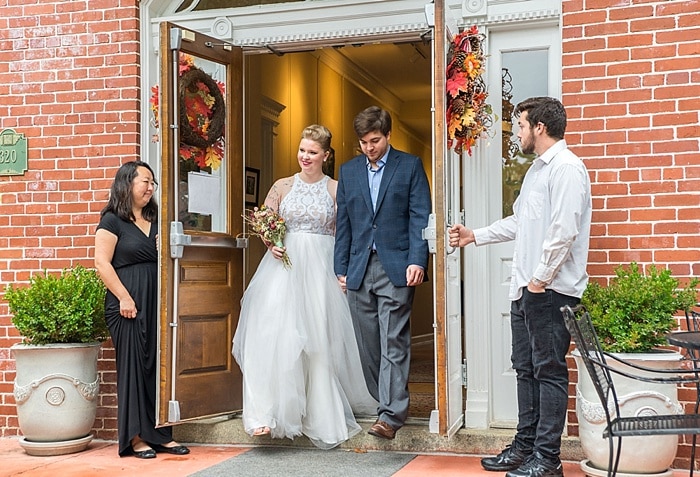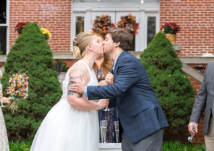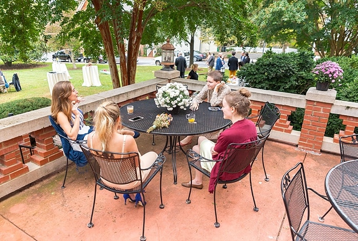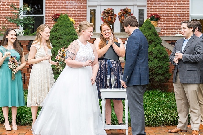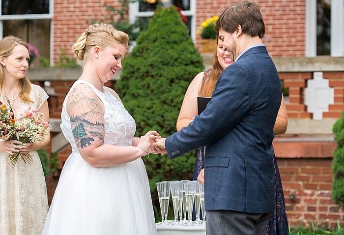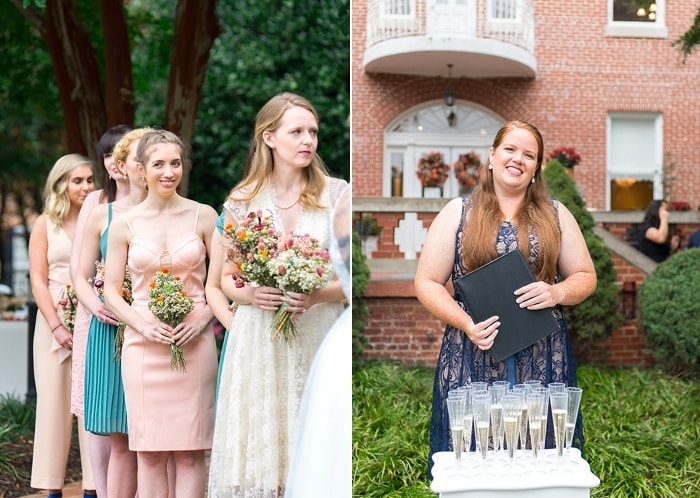 The officiant for the ceremony was my friend Alice. Alice and I met in college and I couldn’t have asked for a better way to include her in the wedding. As for the ceremony itself, I knew I wanted two things: (1) a champagne toast; and (2) traditional vows. For the toast, we handed out champagne before the ceremony. I designed the programs to be coasters (yes, I cut 100 programs into coaster-sized circles by hand). As for the vows, my view is that the wedding is for the guests, but the marriage is for the couple. When my husband and I got married a bit before the wedding day in a private ceremony, we wrote our own vows. For the wedding we used traditional, secular vows. We wrote the ceremony primarily through meaningful quotes that we chose together.